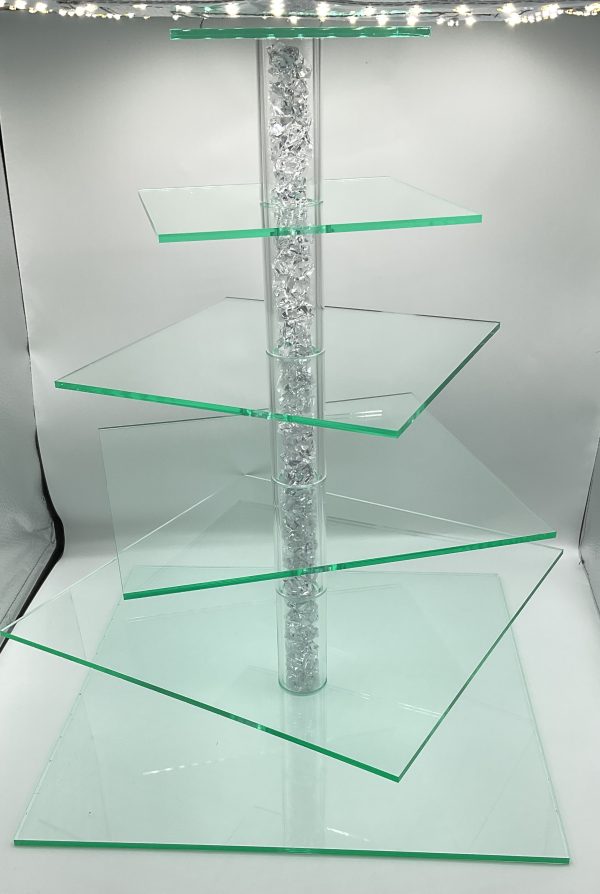 My new revolving square shaped cupcake stand is made with a glass effect like acrylic 6mm thick.It comprises of 6 tiers and will house around 100 cupcakes . The measurements of each tier are 16,14,12,10,8 and 6 inch and is also able to hold a single cake on top as well as cakes below.It has been carefully designed with a hollow tube in the centre that can be filled with crystals and lights to add a spectacular look for any occasion . The square option has the added advantage of being able to arrange each tier to look straight on or offset, to give that extra special look.The base is fixed with the remaining 5 tiers that can be revolved so you can easily pick out a cake without reaching through.This cupcake stand is on another level and with or without the centre tube decorated it really looks beautiful. Consider this an investment that you will use and hire out making you money time and time again